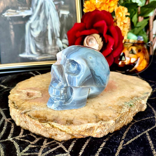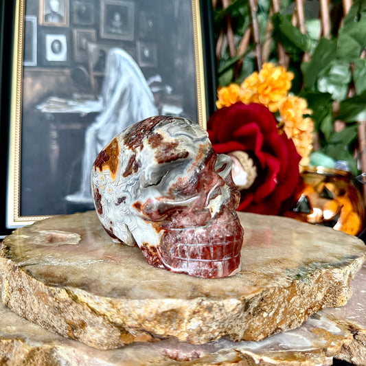 Druzy Mexican Crazy Lace Agate Skull, Laughter & Happiness Stone