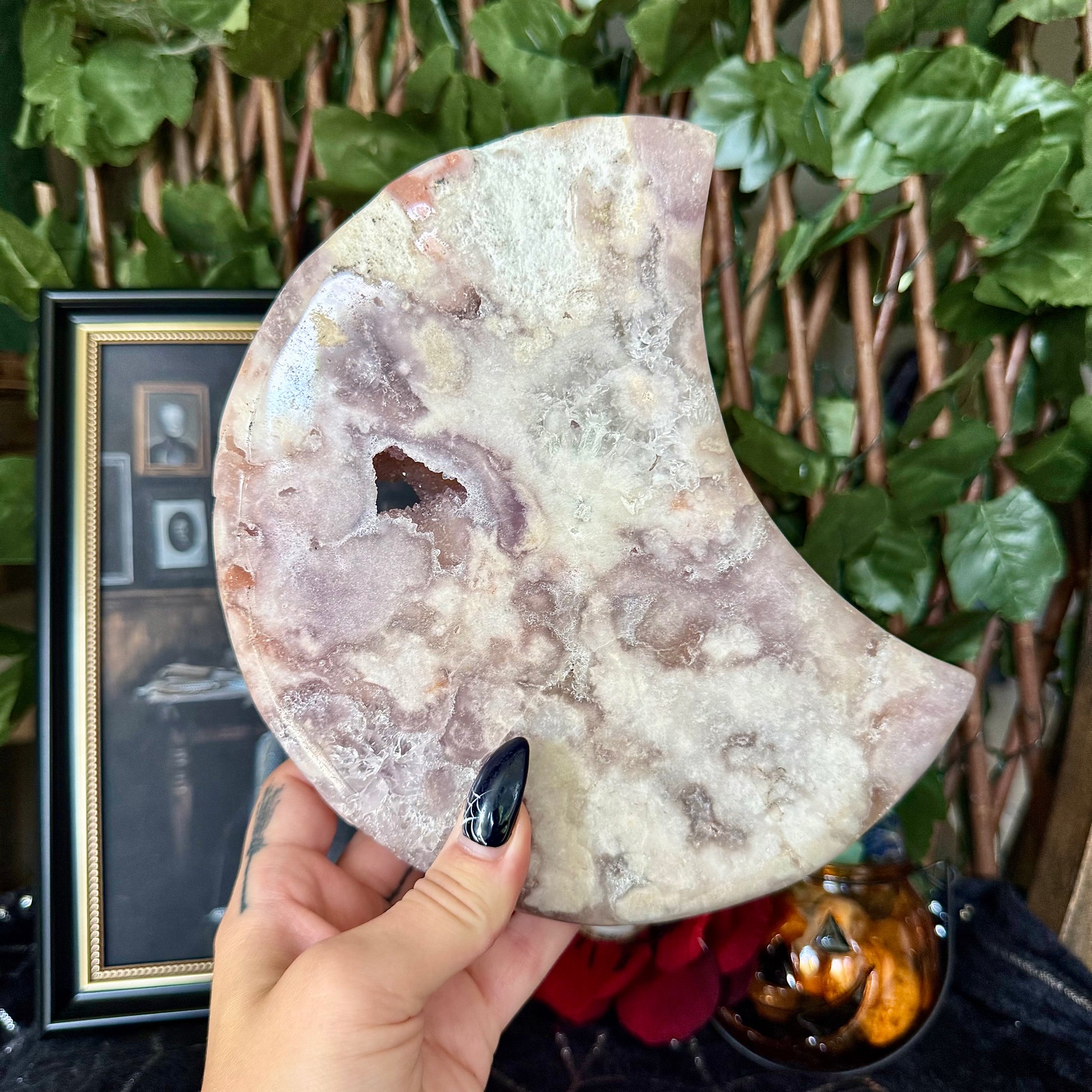 Druzy Pink Amethyst & Flower Agate Crescent Moon, Heart Chakra, New Beginnings Stone
